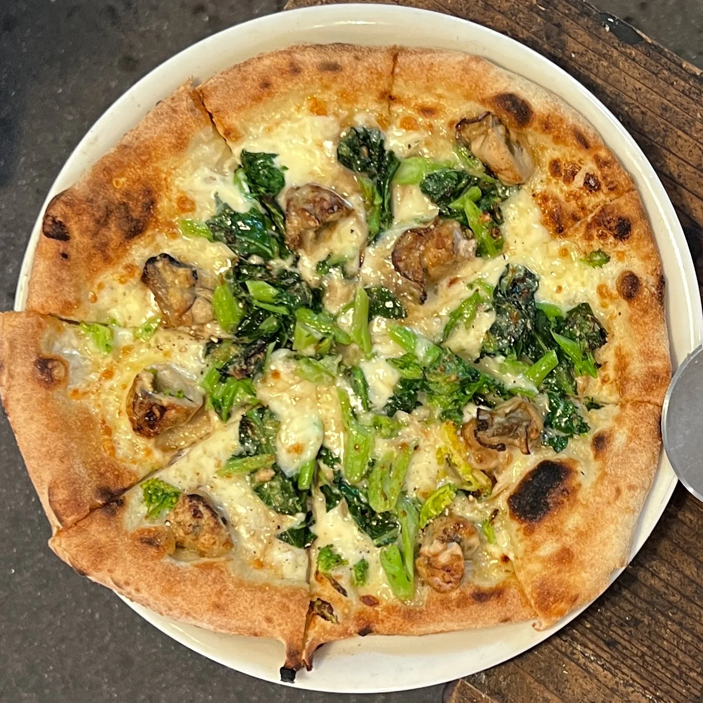 ソテーした広島産の牡蠣を自家製特製オイルでマリネし、旬な野菜と共に焼き上げた牡蠣好き、鞆の浦の観光にお越しになった方におすすめの瀬戸内ならではのピザ。